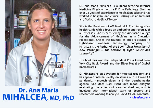 Dr Mihalcea is an advocate for medical freedom and has spoken internationally on issues of the Covid 19 pandemic, nanotechnology, and the transhumanist agenda. She does Dark Field Live Blood Analysis evaluating the effects of vaccine shedding and is involved with international team of doctors and researchers working to analyse Covid 19 vial contents.