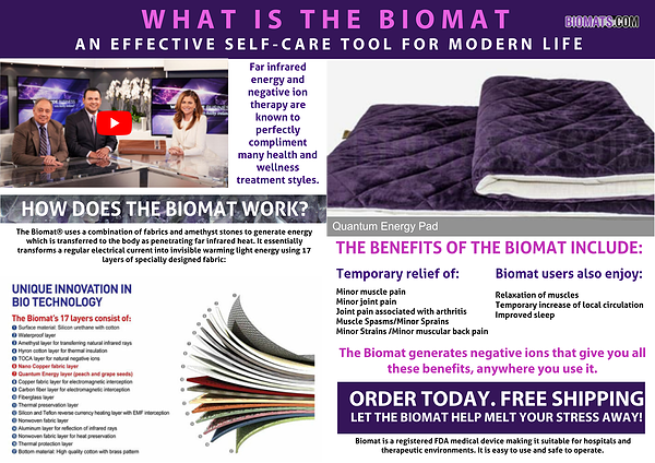 The Biomat® uses a combination of fabrics and amethyst stones to generate energy which is transferred to the body as penetrating far infrared heat. It essentially transforms a regular electrical current into invisible warming light energy using 17 layers of specially designed fabric:
