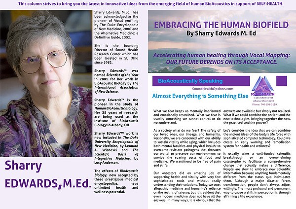 Sharry Edwards™ is the pioneer in the study of Human BioAcoustic Biology. Her 35 years of research are being used at the Institute of BioAcoustic Biology in Albany, OH.