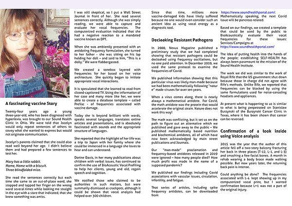 I was still skeptical, so I put a Wall Street Journal in front of her. She read several sentences correctly. Although she was simply reading, we were able to capture and evaluate her vocal frequencies. The computerized evaluation indicated that she had a negative reaction to a mandated vaccine known as DPT.