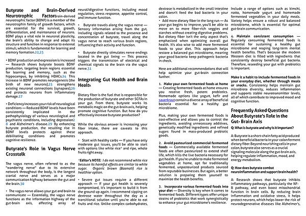 • Butyrate travels along the vagus nerve — Sensory information arising from the gut, including signals related to the presence and concentration of butyrate, travel along the vagus nerve to reach various brain regions, influencing their activity and function.