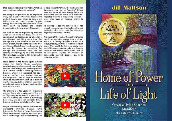 Music comes to the rescue again: cathartic music. The Healing Flower Symphonies creatively take you into the dark side of each emotion (such as impatience versus patience) as a cathartic release – cleansing emotional baggage. Whatever is repressed has power over us; we have been trained since our earliest years to suppress negative emotions. These do not vanish but show up as outward negative energy, such as anger or aggression, or an inward force manifesting as depression, insecurity, or illness.