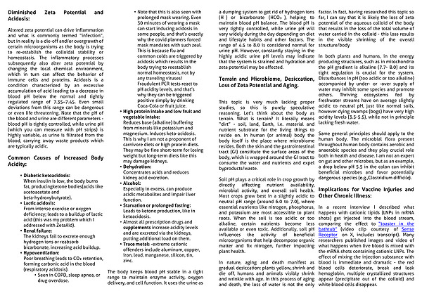 Altered zeta potential can drive inflammation and what is commonly termed “infection”, but in reality is a die-off and/or overgrowth of certain microorganisms as the body is trying to re-establish the colloidal stability or homeostasis. The inflammatory processes subsequently also alter zeta potential by changing the local chemical environment, which in turn can affect the behavior of immune cells and proteins. Acidosis is a condition characterized by an excessive accumulation of acid leading to a decrease in blood pH below the normal and tightly regulated range of 7.35–7.45. Even small deviations from this range can be dangerous or even life threatening. Note that the pH of the blood and urine are different parameters - blood pH is tightly controlled, while urine pH (which you can measure with pH strips) is highly variable, as urine is filtrated from the blood, carrying away waste products which are typically acidic.
