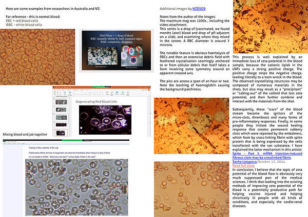 This process is well explained by an immediate loss of zeta potential in the blood sample, because the cationic lipids in the LNPs carry a strong positive charge. The positive charge strips the negative charge, leading literally to a train wreck in the blood. The observed crystallizing structures may be composed of numerous materials in the shots, but also may result as a “precipitant” or “salting-out” of the colloid that lost zeta potential, and then further combine and interact with the materials from the shot.