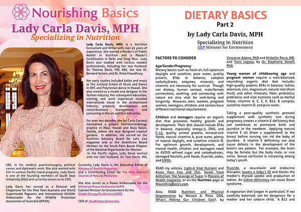 Lady Carla Davis, MPH, is a Nutrition Consultant and Writer with over 45 years of experience. She earned a Master’s of Public Health in Nutrition and a Master’s Certification in Reiki and Feng Shui. Lady Davis also studied with various notable professionals, including her late husband, Sir Thomas Davis, MD, KBE, the late Dr. Bernard Jensen, and Dr. Reza Chowdhury.