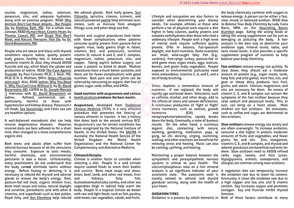 Oxidation is a process by which elements in the body chemically combine with oxygen to release energy.  A person can be either a fast, slow, mixed, or balanced oxidizerREAD How to Balance Your Body Chemistry by Lady Carla Davis, MPH, on the Nourishing Basics Nutrition pageEating the wrong foods or taking the wrong supplements can be just as damaging as polluting the body.  A hair analysis is the best way to determine your oxidation type, mineral levels, ratios, and toxic metal levels.  It also provides a specific supplement program of nutrients to help balance your body chemistry.