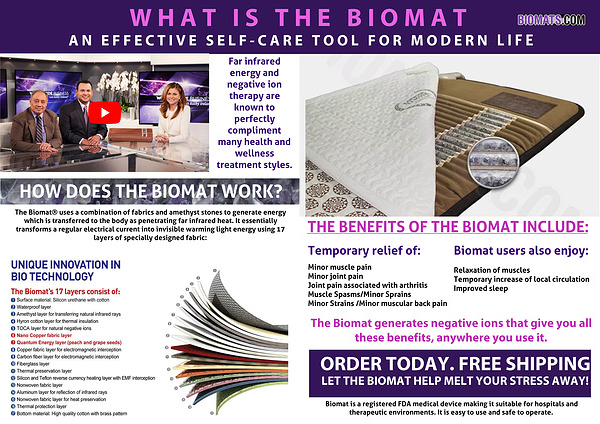 The Biomat® uses a combination of fabrics and amethyst stones to generate energy which is transferred to the body as penetrating far infrared heat. It essentially transforms a regular electrical current into invisible warming light energy using 17 layers of specially designed fabric: