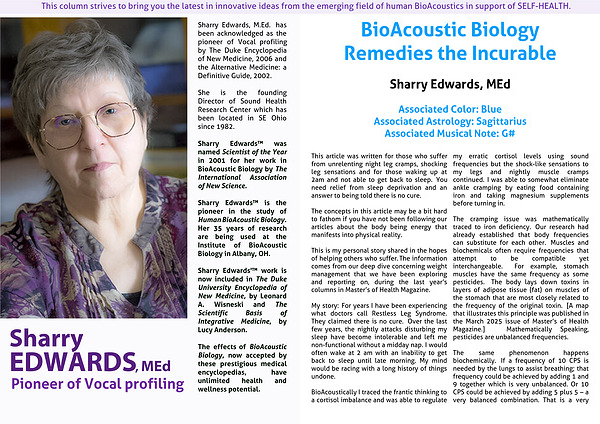 The cramping issue was mathematically traced to iron deficiency. Our research had already established that body frequencies can substitute for each other. Muscles and biochemicals often require frequencies that attempt to be compatible yet interchangeable. For example, stomach muscles have the same frequency as some pesticides. The body lays down toxins in layers of adipose tissue (fat) on muscles of the stomach that are most closely related to the frequency of the original toxin. [A map that illustrates this principle was published in the March 2025 issue of Master’s of Health Magazine.] Mathematically Speaking, pesticides are unbalanced frequencies.