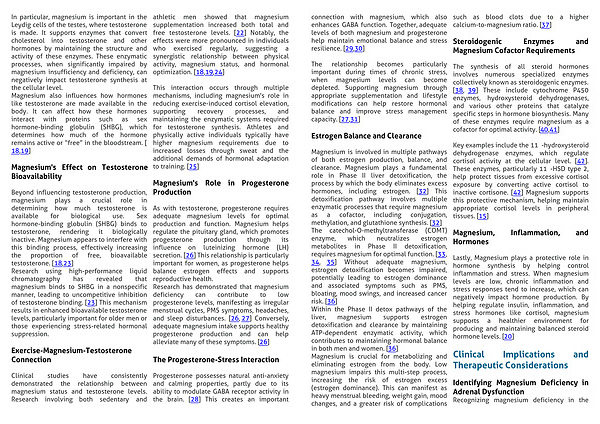 Lastly, Magnesium plays a protective role in hormone synthesis by helping control inflammation and stress. When magnesium levels are low, chronic inflammation and stress responses tend to increase, which can negatively impact hormone production. By helping regulate insulin, inflammation, and stress hormones like cortisol, magnesium supports a healthier environment for producing and maintaining balanced steroid hormone levels. [20]