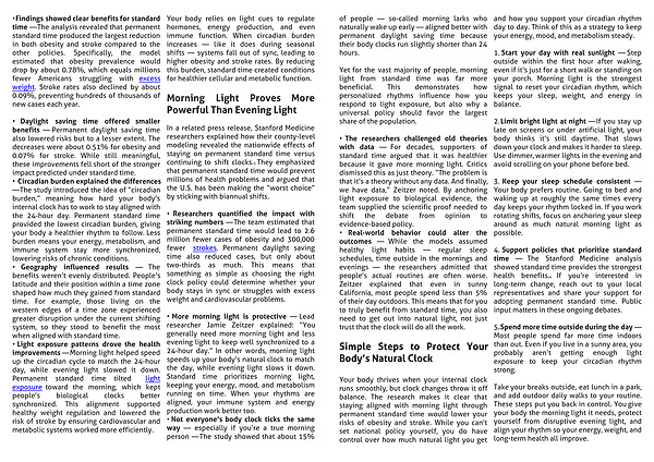 • Light exposure patterns drove the health improvements — Morning light helped speed up the circadian cycle to match the 24-hour day, while evening light slowed it down. Permanent standard time tilted light exposure toward the morning, which kept people’s biological clocks better synchronized. This alignment supported healthy weight regulation and lowered the risk of stroke by ensuring cardiovascular and metabolic systems worked more efficiently.