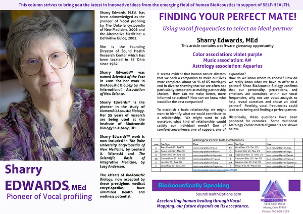 Sharry Edwards™ is the pioneer in the study of Human BioAcoustic Biology. Her 35 years of research are being used at the Institute of BioAcoustic Biology in Albany, OH.