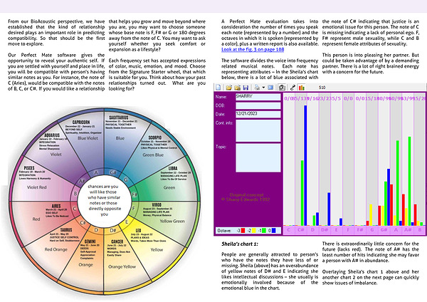 A Perfect Mate evaluation takes into consideration the number of times you speak each note (represented by a number) and the octaves in which it is spoken (represented by a color), plus a written report is also available.