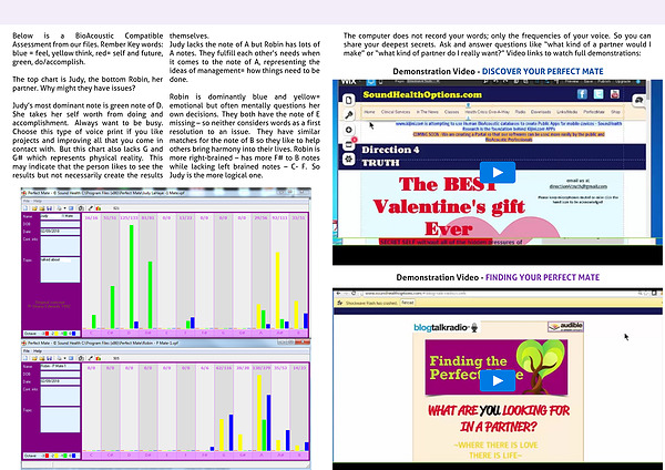 The computer does not record your words; only the frequencies of your voice. So you can share your deepest secrets. Ask and answer questions like “what kind of a partner would I make” or “what kind of partner do I really want?” Video links to watch full demonstrations: