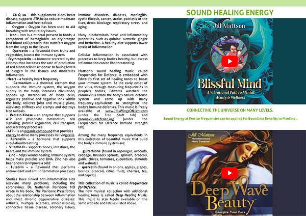 Mattson's sound healing music, called Frequencies for Defence, is embedded with Edward's first set of healing tones to boost your immune system. At the early onset of the virus, through measuring frequencies in people's bodies, Edwards watched the coronavirus attack the body's natural defense system and came up with many frequency-equivalents to strengthen the body's immune defenses. This music is freely available at www.JillsWingsOfLight.com (under the Free Stuff tab) and coronavirusdefence.org (under the Frequencies for Defence Immune strength tab).