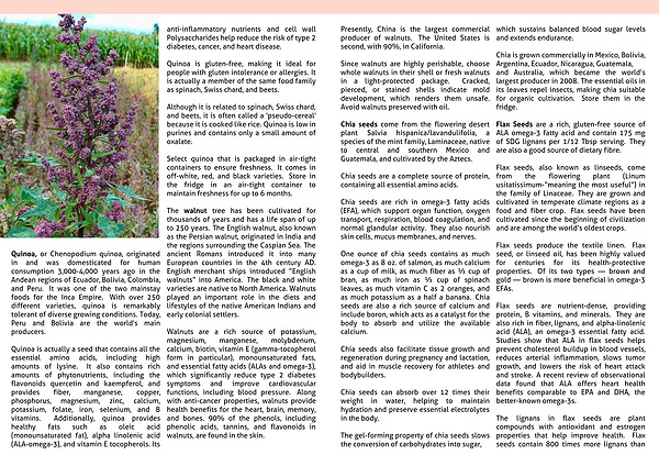 One ounce of chia seeds contains as much omega-3 as 8 oz. of salmon, as much calcium as a cup of milk, as much fiber as cup of bran, as much iron as cup of spinach leaves, as much vitamin C as 2 oranges, and as much potassium as a half a banana.  Chia seeds are also a rich source of calcium and include boron, which acts as a catalyst for the body to absorb and utilize the available calcium.