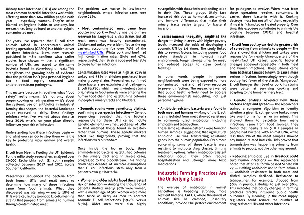 Researchers sequenced the bacteria from both human UTIs and retail meat to determine how many of these infections came from food animals. What they discovered was alarming — nearly 18% of UTIs were caused by zoonotic E. coli, meaning strains that jumped from animals to humans through contaminated meat.