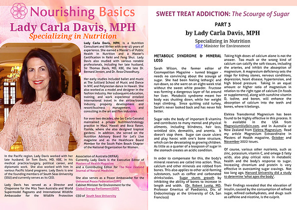 Lady Carla Davis, MPH, is a Nutrition Consultant and Writer with over 45 years of experience. She earned a Master’s of Public Health in Nutrition and a Master’s Certification in Reiki and Feng Shui. Lady Davis also studied with various notable professionals, including her late husband, Sir Thomas Davis, MD, KBE, the late Dr. Bernard Jensen, and Dr. Reza Chowdhury.