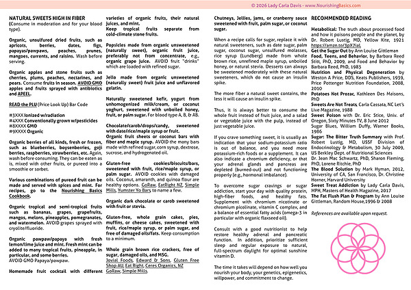 When a recipe calls for sugar, replace it with natural sweeteners, such as date sugar, palm sugar, coconut sugar, unsulfured molasses, rice syrup (Lundberg) made from whole brown rice, unrefined maple syrup, unboiled honey, or natural stevia. Desserts can always be sweetened moderately with these natural sweeteners, which do not cause an insulin spike.
