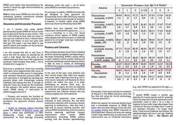 Since DMSO’s properties seem naturally indicated to treat cataracts, this has been extensively explored, with numerous doctors reporting at conferences40,41 that they had a high rate of success treating cataracts with various DMSO combinations, and many online likewise reporting significant cataract improvement from various DMSO combinations (including DMSO authors working with the German ophthalmology community).