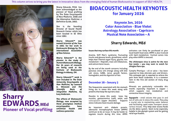 Sharry Edwards™ is the pioneer in the study of Human BioAcoustic Biology. Her 35 years of research are being used at the Institute of BioAcoustic Biology in Albany, OH.