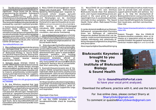 11. Many COVID-19-vaccinated individuals report ringing in the ears (tinnitus). BioAcoustic records show that potassium, actin, and myosin-related frequencies are present in the vocal prints of persons reporting tinnitus. It usually takes months to eliminate tinnitus symptoms. The Sound Health Portal offers Math-based Tinnitus evaluations.