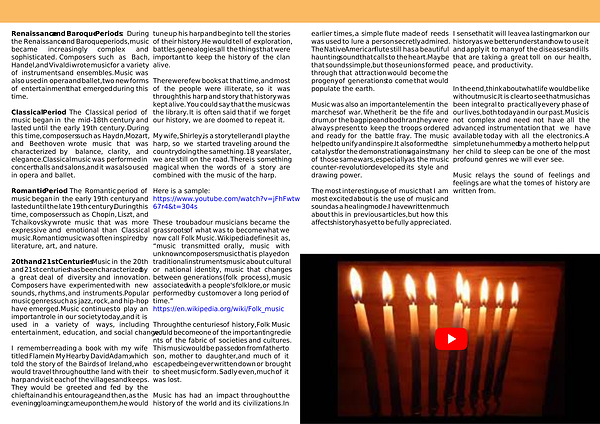 20th and 21st Centuries: Music in the 20th and 21st centuries has been characterized by a great deal of diversity and innovation. Composers have experimented with new sounds, rhythms, and instruments. Popular music genres such as jazz, rock, and hip-hop have emerged. Music continues to play an important role in our society today, and it is used in a variety of ways, including entertainment, education, and social change."