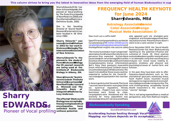 Since December 2019, the Sound Health Research Center has been BioAcoustically reporting on the potential influence and outcomes of Covid- 19. Vocal anomaly evaluation has been used for nearly 40 years in an attempt to verify that vocal frequency analyses can reveal issues relating to genetics, emotions, and physical and psychological issues of human form and function.