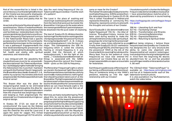 The text of Exodus 25:31-40 describes the fashioning of the Menorah. In working out the chord progressions for this piece of furniture the rising chord pattern of F – A – B – C shows up and strongly places it into the key of F major. This corresponds to the 528 Hz frequency which is called the creative, healing, or miracle frequency. Is it any wonder that the Menorah, of which Yeshua/Jesus said, “I Am the light of the world…,” - Creator, Sustainer, Redeemer of all things is associated with the 528Hz frequency! Even the name of the Creator – YHVH – gives us the 528 Hz frequency.