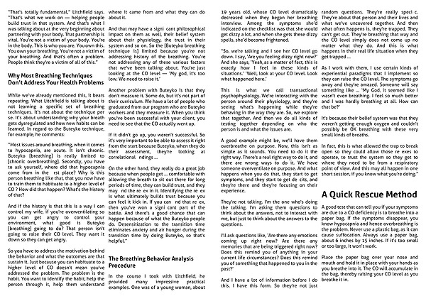 While we’ve already mentioned this, it bears repeating. What Litchfield is talking about is not learning a specific set of breathing techniques. It’s not about the technique per se. It’s about understanding why your breath gets dysregulated and how new habits can be learned. In regard to the Buteyko technique, for example, he comments: