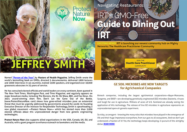 He has consulted elected officials and world leaders on every continent, been quoted in The New York Times, Washington Post, and Time Magazine, and regularly appears on major broadcast media, including The Doctors, the Dr. Oz Show, BBC, and Fox News. His 2021 award-winning short film, Don’t Let the Gene Out of the Bottle, (www.ProtectNatureNow. com) shows how gene-edited microbes pose an existential threat that must be urgently addressed by governments around the world. As founding Executive Director of the Institute for Responsible Technology, Smith is spearheading a new global movement —Protect Nature Now— which has alerted more than 2,000 elected officials about this unprecedented danger from new genetic engineering technologies.