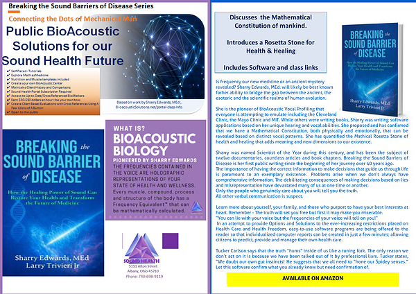 Clinic, the Mayo Clinic and MIT. While others were writing books, Sharry was writing software applications based on her unique hearing and vocal abilities. She proposed and has confirmed that we have a Mathematical Constitution, both physically and emotionally, that can be revealed based on distinct vocal patterns. She has quantified the Mathical Rosetta Stone of health and healing that adds meaning and new dimensions to our existence.