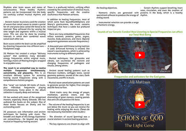 Jill Mattson has created a unique “delivery system” that combines many desirable energy frequencies within original music, forming a matrix of Healing Energies wrapped in enjoyable tunes.