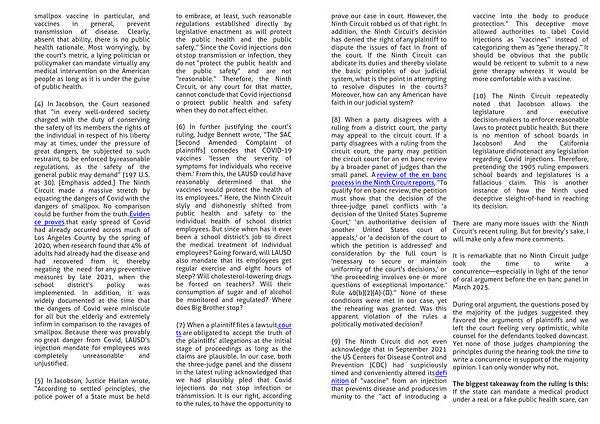 {6} In further justifying the court’s ruling, Judge Bennett wrote, “The SAC [Second Amended Complaint of plaintiffs] concedes that COVID-19 vaccines 'lessen the severity of symptoms for individuals who receive them.' From this, the LAUSD could have reasonably determined that the vaccines would protect the health of its employees.” Here, the Ninth Circuit slyly and dishonestly shifted from public health and safety to the individual health of school district employees. But since when has it ever been a school district’s job to direct the medical treatment of individual employees? Going forward, will LAUSD also mandate that its employees get regular exercise and eight hours of sleep? Will cholesterol-lowering drugs be forced on teachers? Will their consumption of sugar and of alcohol be monitored and regulated? Where does Big Brother stop?
