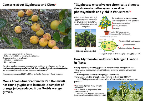 “Glyphosate excessive use chronically disrupts the shikimate pathway and can affect photosynthesis and yield in citrus trees”*