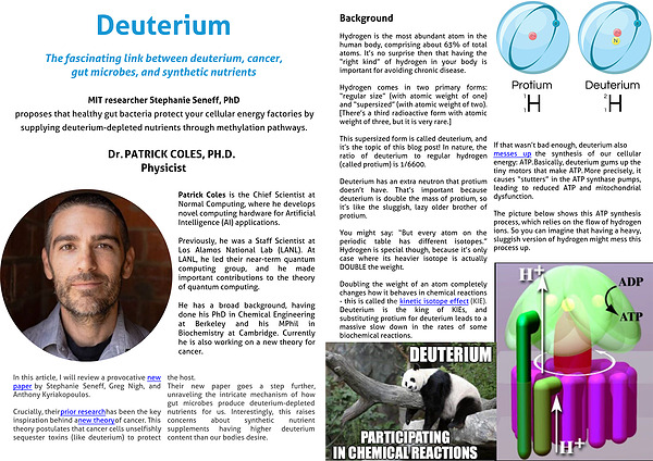 messes up the synthesis of our cellular energy: ATP. Basically, deuterium gums up the tiny motors that make ATP. More precisely, it causes “stutters” in the ATP synthase pumps, leading to reduced ATP and mitochondrial dysfunction.