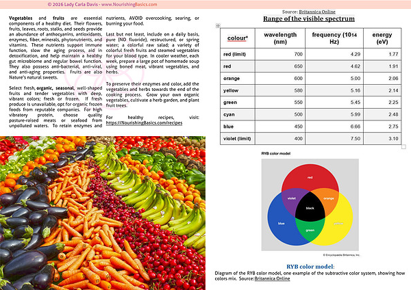 Vegetables and fruits are essential components of a healthy diet. Their flowers, fruits, leaves, roots, stalks, and seeds provide an abundance of anthocyanins, antioxidants, enzymes, fiber, minerals, phytonutrients, and vitamins. These nutrients support immune function, slow the aging process, aid in detoxification, and help maintain a healthy gut microbiome and regular bowel function. They also possess anti-bacterial, anti-viral, and anti-aging properties. Fruits are also Nature’s natural sweets.