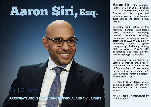Aaron Siri is the Managing Partner of Siri & Glimstad, which has 100+ professionals, where he focuses on civil rights and informed consent, and handles class actions and complex civil matters.