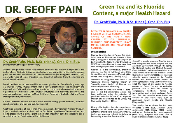 Geoff was a member of the former Western Australia Environment Minister Panel of Experts, and advised the Minister to close Brookdale Liquid Waste Treatment Plant and not to proceed with a similar plant at Kemerton industrial park. He expects to see a worldwide ban on Fluoridation within his lifetime.