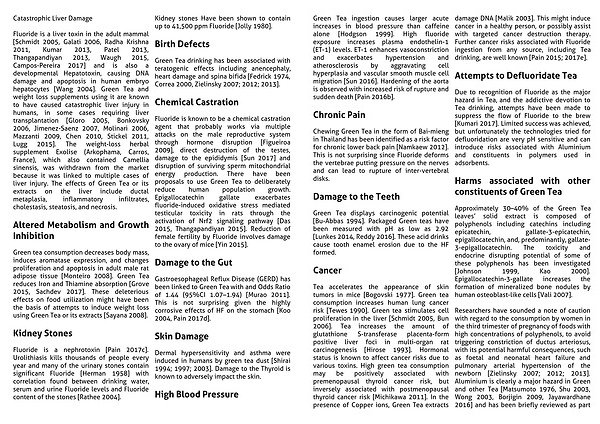 Fluoride is a liver toxin in the adult mammal [Schmidt 2005, Galati 2006, Radha Krishna 2011, Kumar 2013, Patel 2013, Thangapandiyan 2013, Waugh 2015, Campos-Pereira 2017] and is also a developmental Hepatotoxin, causing DNA damage and apoptosis in human embryo hepatocytes [Wang 2004]. Green Tea and weight loss supplements using it are known to have caused catastrophic liver injury in humans, in some cases requiring liver transplantation [Gloro 2005, Bonkovsky 2006, Jimenez-Saenz 2007, Molinari 2006, Mazzanti 2009, Chen 2010, Stickel 2011, Lugg 2015]. The weight-loss herbal supplement Exolise (Arkophama, Carros, France), which also contained Camellia sinensis, was withdrawn from the market because it was linked to multiple cases of liver injury. The effects of Green Tea or its extracts on the liver include ductal metaplasia, inflammatory infiltrates, cholestasis, steatosis, and necrosis.