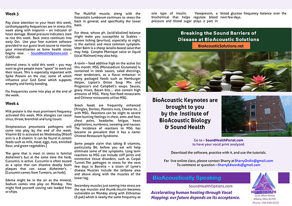 Pay close attention to your heart this week, cardiomyopathy frequencies are in stress this week along with troponin – an indicator of heart damage. Blood pressure indicators start to rise this week. Back stress continues into early Oct. Use your free nutrient software provided in our guest level course to monitor your mineralization as bone health stress begins now. - SoundHealthOptions.com – CLASS tab